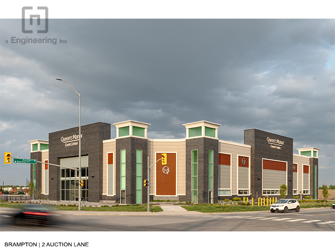 n Engineering Inc was retained in 2019 to provide civil engineering services for the development of a convention centre on a 3.08-acre site located at the intersection of Queen Street East and Auction Lane in Brampton. The project was designed to accommodate conference and social gathering events, creating a versatile facility that supports both business functions and community gatherings.